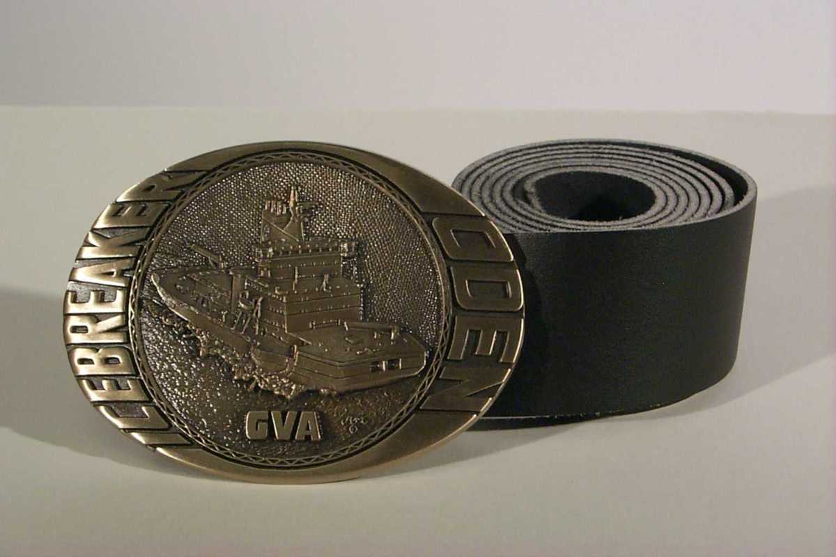 Spänne: Ovalformad bricka i gjuten oxiderad mässing. I ytterkanterna står ICEBREAKER resp ODEN i versaler. Centralt cirkelformat fält i relief med bild av ODEN och bokstäverna GVA i nedre kanten. På baksidan står: AM © AWARD DESIGN MEDALS INC. P O BOX 1088 NORMAN, OKLA 73070