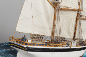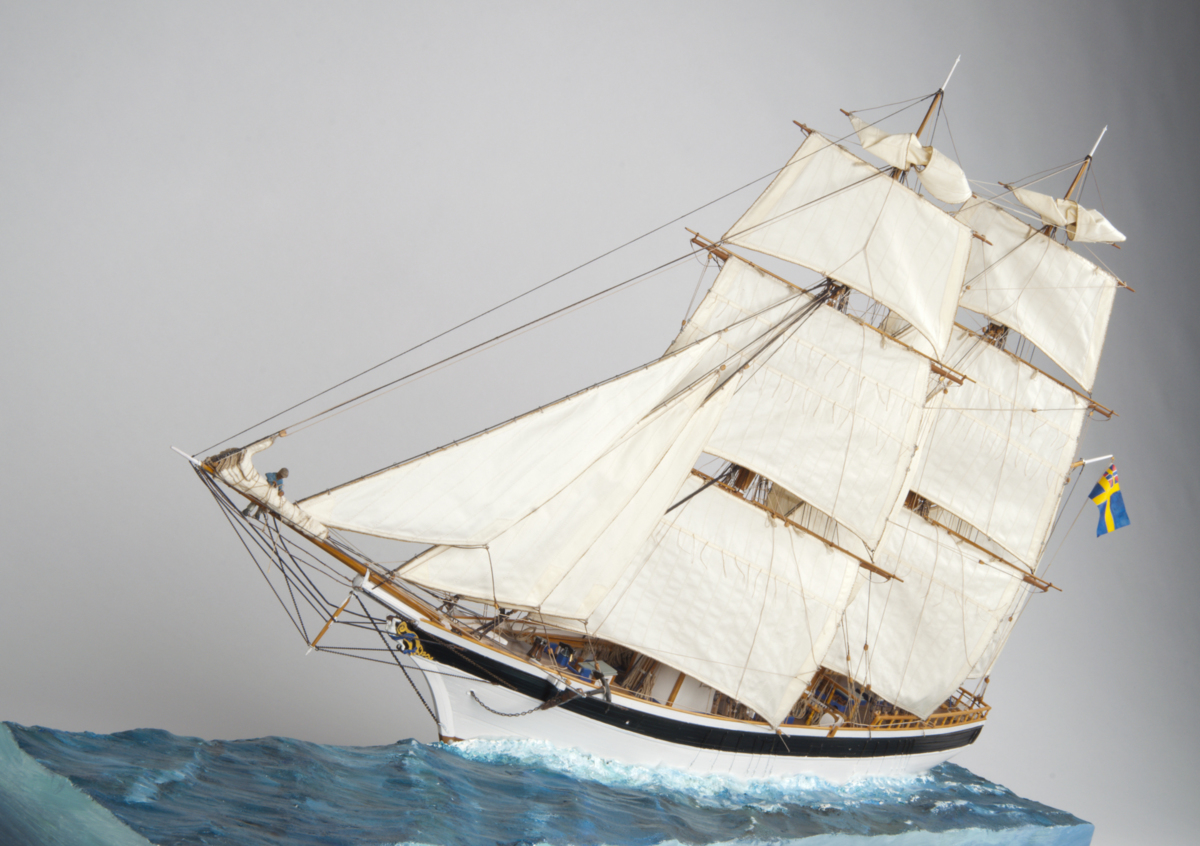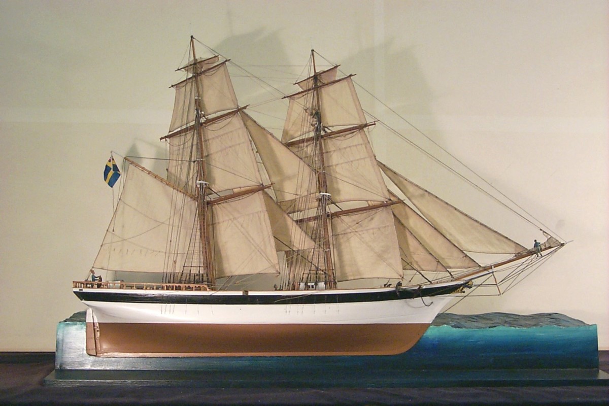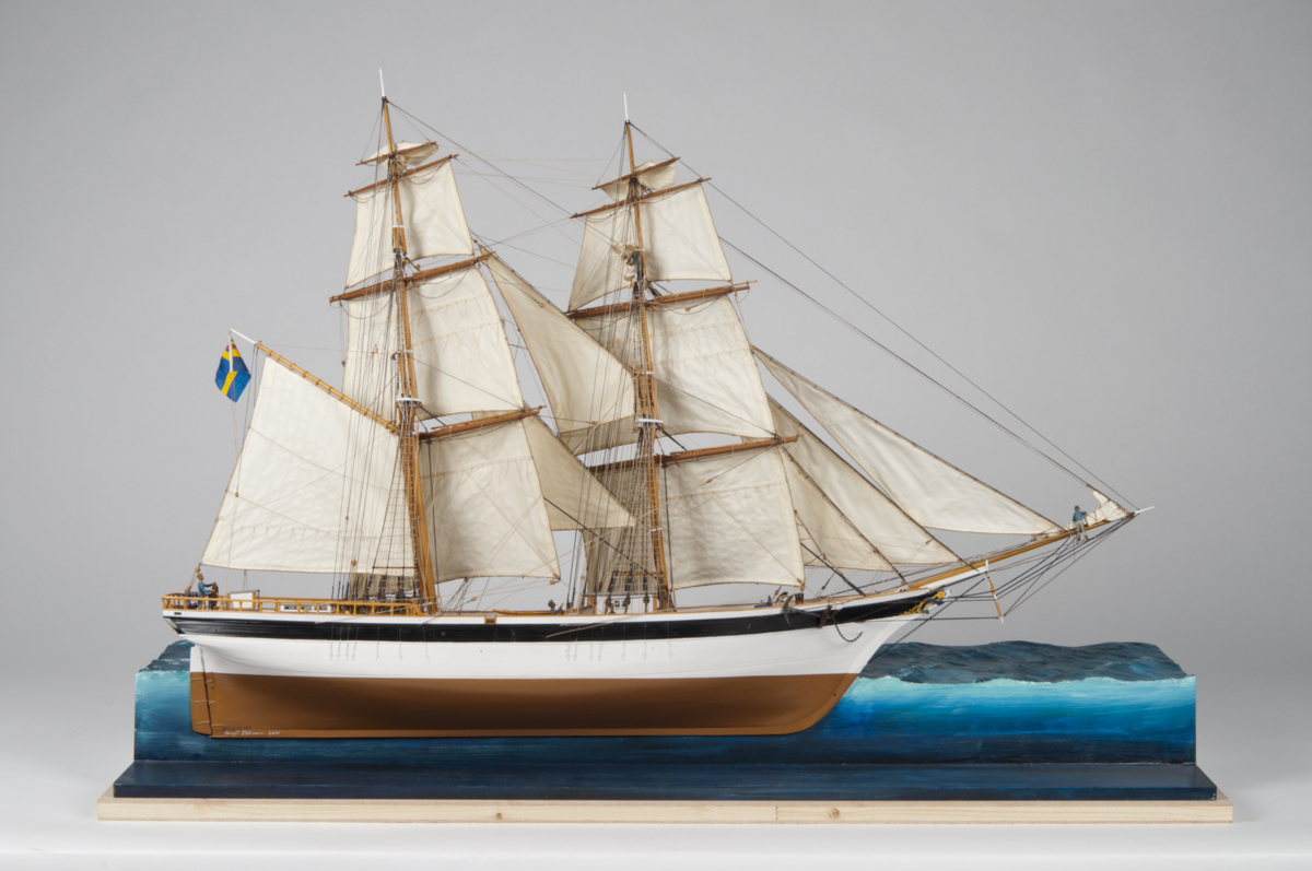 Modell av en brigg med satta segel. Modellen är monterad på en blåfärgad platta som visar hav på babordssidan och undervattenskrovet på stybordssidan Skrovet ät vitt med kopparbotten och svart brädgång. Vita däckshus med grå tak.