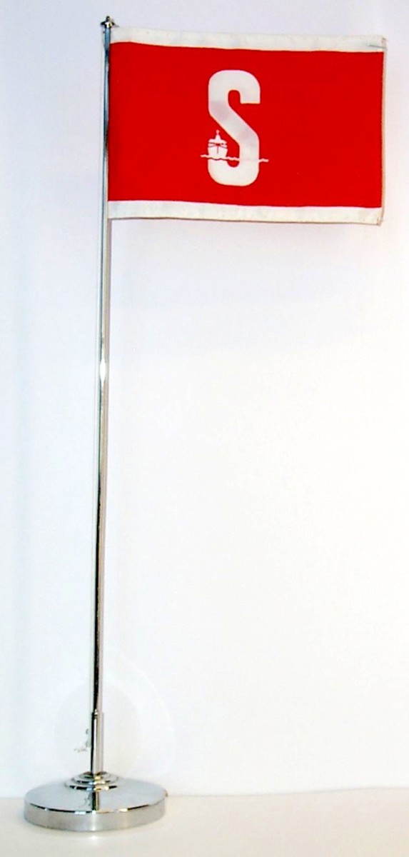 Rederiflagga för Stena line i två lager polyester sydd runt om. Brett rött längsgående band med infälld logotyp, ett S med fartygssektion vilande på den nedre kroken i esset. På båda sidor om det röda fältet ett smalt vitt fält.
