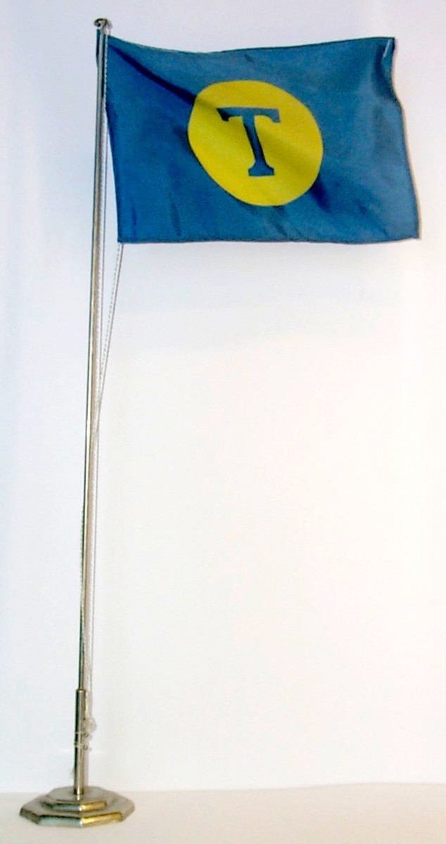 Rederiflagga för Thore Shipping i två lager sydd runt om. Blått tyg med ett gult runt tryckt fält omslutande ett otryckt T.