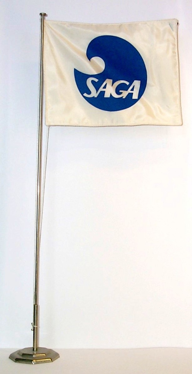 Rederiflagga för Lion Svelast två lager sydd runt om. Vitt tyg med ett tryckt rederimärke, ett blått runt fält med en krokliknande öppning på vänstra sida och med texten SAGA i vitt på den nedre delen.