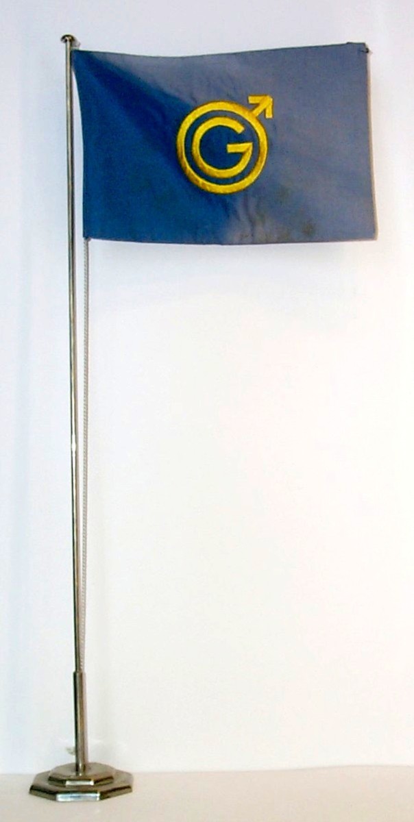 Rederiflagga för Grängesrederiet i blått dubbelt tyg. Flaggan har ett broderat rederimärke i guldfärg, en cirkel med pil pekande snett upp åt höger med ett 'G' inom cirkeln.