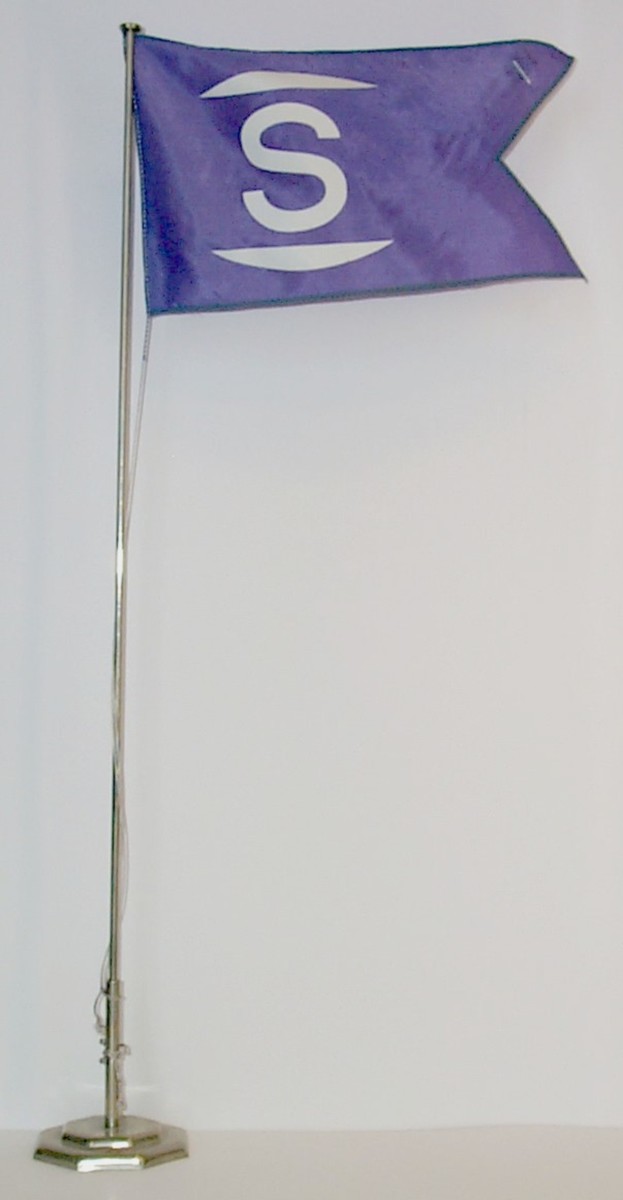 Tvåtungad rederiflagga för Saléns i blått tyg med söm runt kanten. Flaggan har ett vitt tryckt rederimärke, ett 'S' med ett cirkelsegment över respektive under esset.