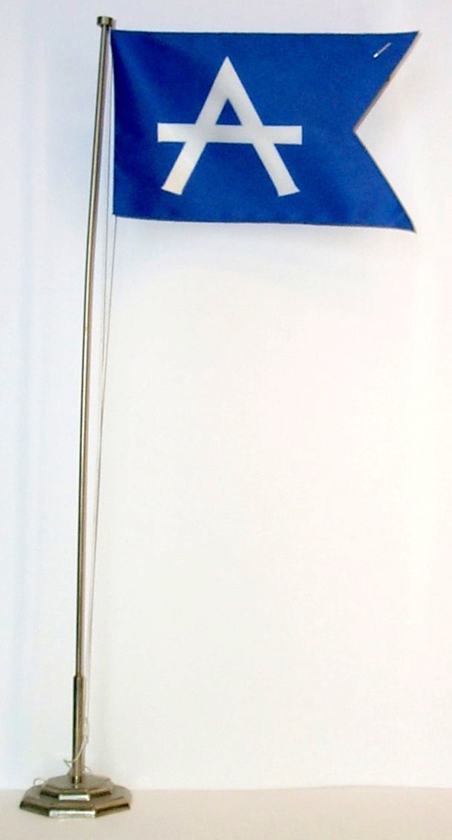 Tvåtungad rederiflagga för Argonaut AB dubbelt vitt tyg med söm runt om. Flaggan är helfärgad blått utan ett 'A' med extra lång tvärpinne.