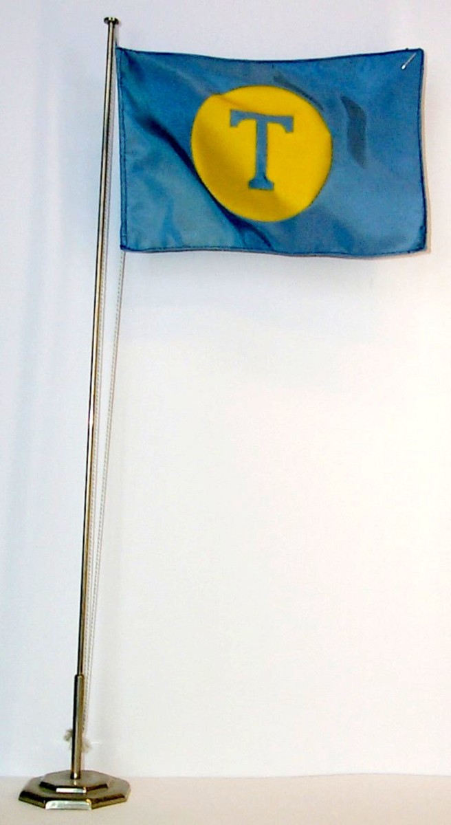 Rederiflagga för Thore shipping av blått tyg med vikt sydd kant runt om. Flaggan har en gul tryckt cirkel med ett otryckt 'T' i mitten.