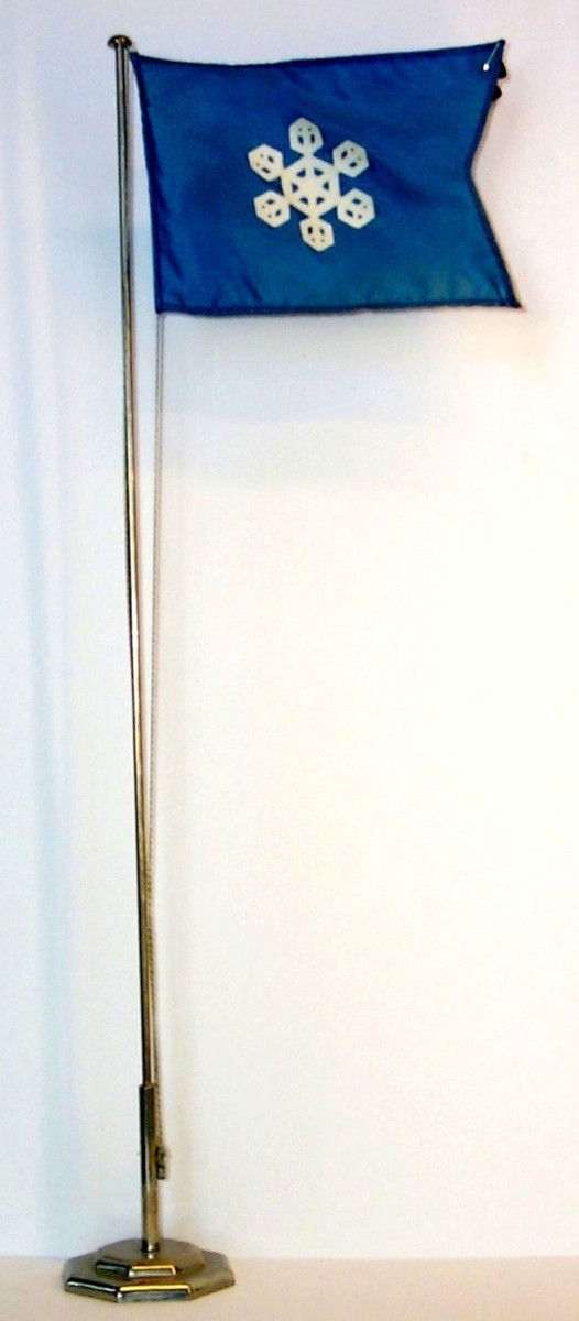 Svagt tvåtungad rederiflagga för Polar av blått tyg med sydd kant runt om. Flaggan har ett vitt tryckt rederimärke som består av en snökristall.