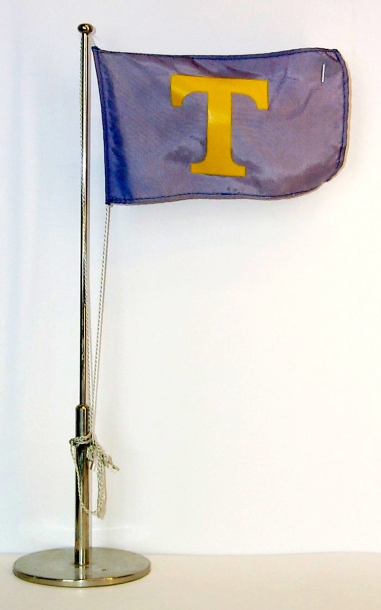Rederiflagga för Rederi AB Transmarin blått tyg med fåll runt kanten. I mitten har flaggan har ett 8 cm stort gult tryckt 'T'.