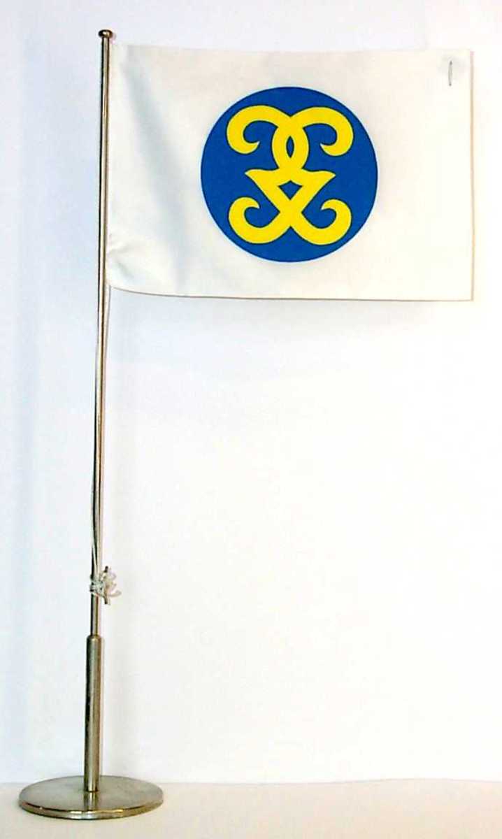 Rederiflagga för Gorthons Rederi AB av dubbelt vitt tyg och med svetsad kant runt om. Rederimärket består av en blå cirkel med två korslagda 'g' varav det ena är vertikalt spegelvänt.