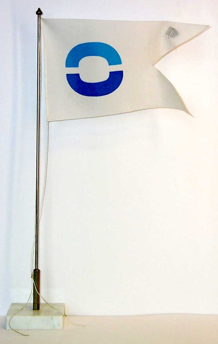 Rederistandar för Cool Carriers av vit polyester med fållad bakkant. Rederimärke som ett horisontellt avskuret 'O' där den övre halvan är ljusblå och den undre är mörkblå.