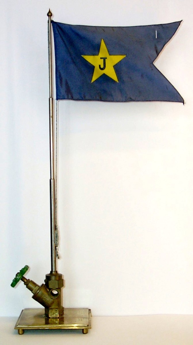 Tvåtungad rederiflagga för Jonson Lines av blå polyester med sydd kant. Flaggan har en 8 cm höga gul påtryckt stjärna med ett otryckt blått 'J' i centrum.