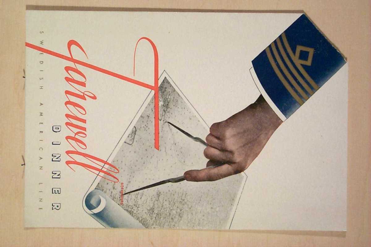 Matsedel från m/s GRIPSHOLM lördagen den 23 april 1949. På framsidan en officersarm hållande en passare över ett sjökort. Passarens ena spets pekar på Göteborg. Under bilden texten 'Farewell Dinner'.