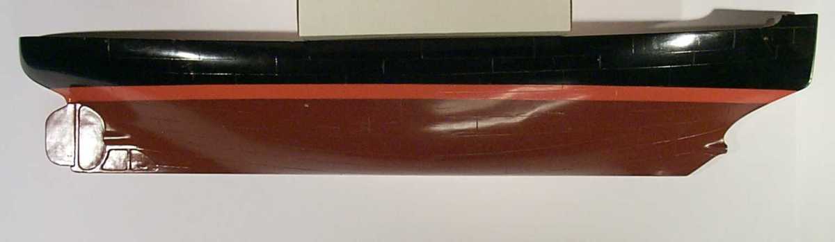 Halvmodell av massivt lamellimmat trä utan överbyggnad. Plåtskarvar är utskurna ur skrovet. Bordläggningen är svartmålad och skild från den bruna botten med ett orange band. Modellen är en gåva från en direktör på Eriksberg till Ralph Theslöf.