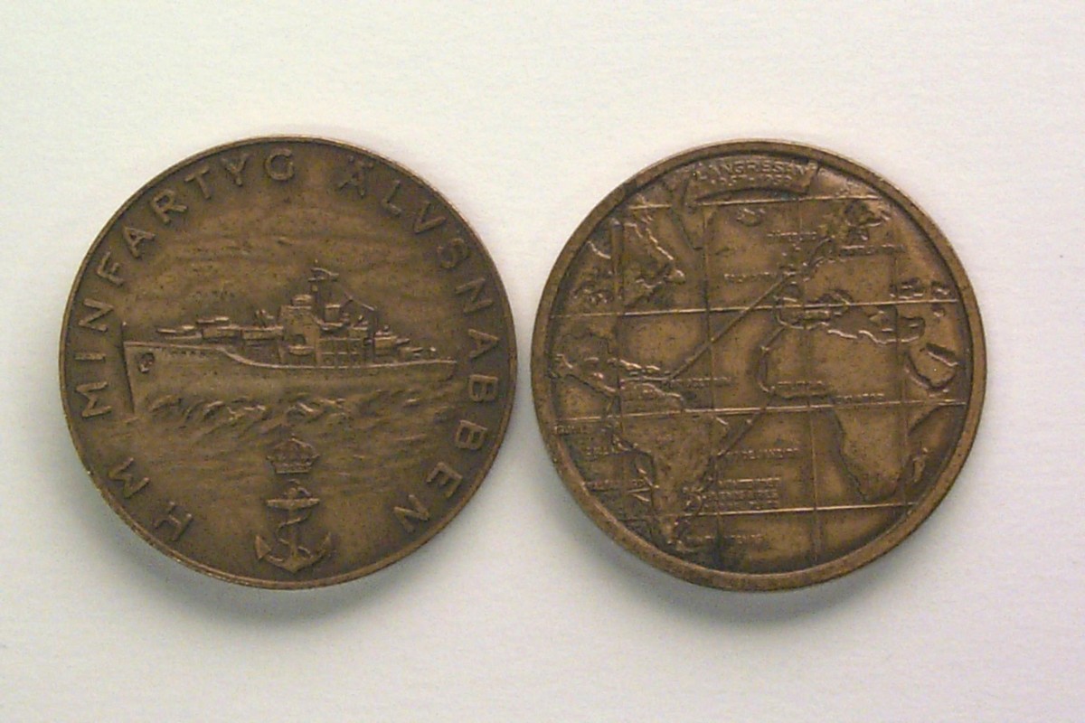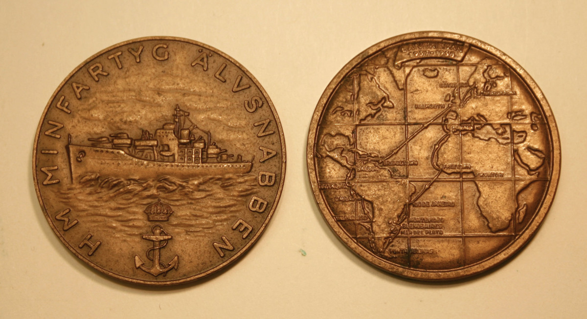 Rund minnesmedalj i brons från Älvsnabbens långresa 1957-1958. Ena sidan visar Älvsnabben i centrum, nedtill marinens krönta ankare och runt om texten 'HM MINFARTYG ÄLVSNABBEN'. Den andra sidan visar en karta över färdvägen