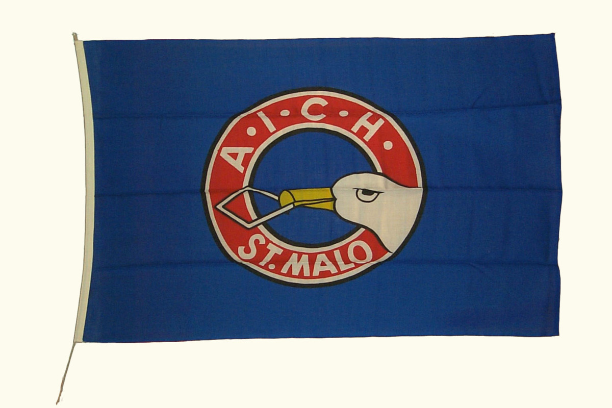 Kap Horns klubbens flagga som är blå med ett rött cirkelband med vit och svart bård. I cirkelbandet står 'A.I.C.H ST. MALO'. Delvis över cirkelbandet syns ett albatrosshuvud.