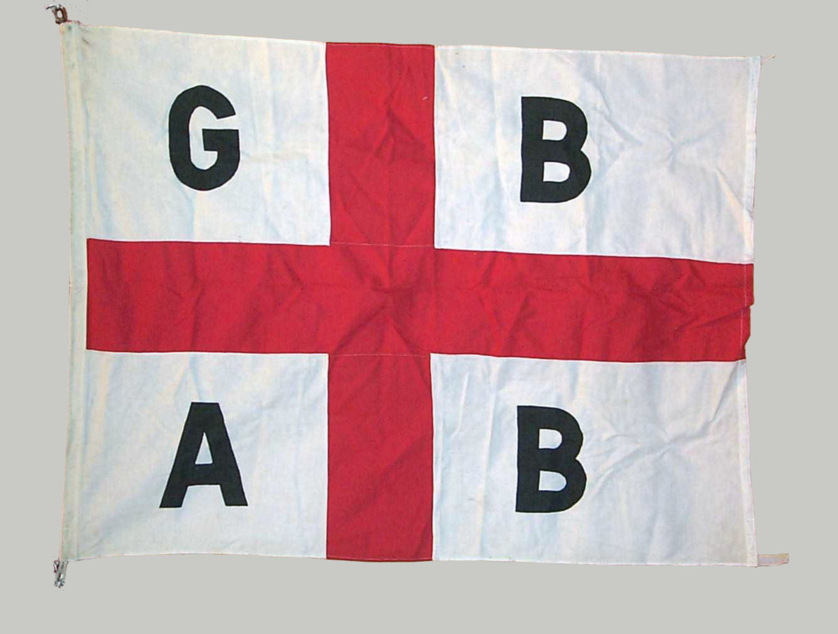 Vit flagga med rött kors samt svarta versaler (G, B A resp. B), en i varje vitt fält. Korset och de vita fälten är sydda tillsammans De svarta boktäverna är av svart tyg som är fastsydda på flaggan.
