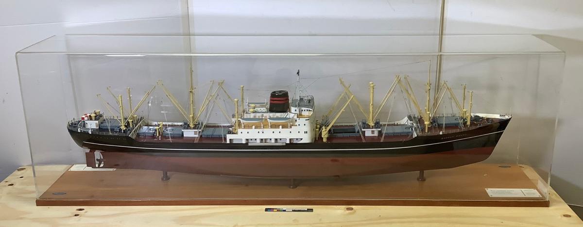 Svart skrov, brunröd botten med rödbrunt bälte, svart poopdäck, övriga däck rödbruna, vita däckshus med trädäck, 7 grå lastluckor varav 1 öppen, svart skorsten med två röda band, blekgula master och bommar.