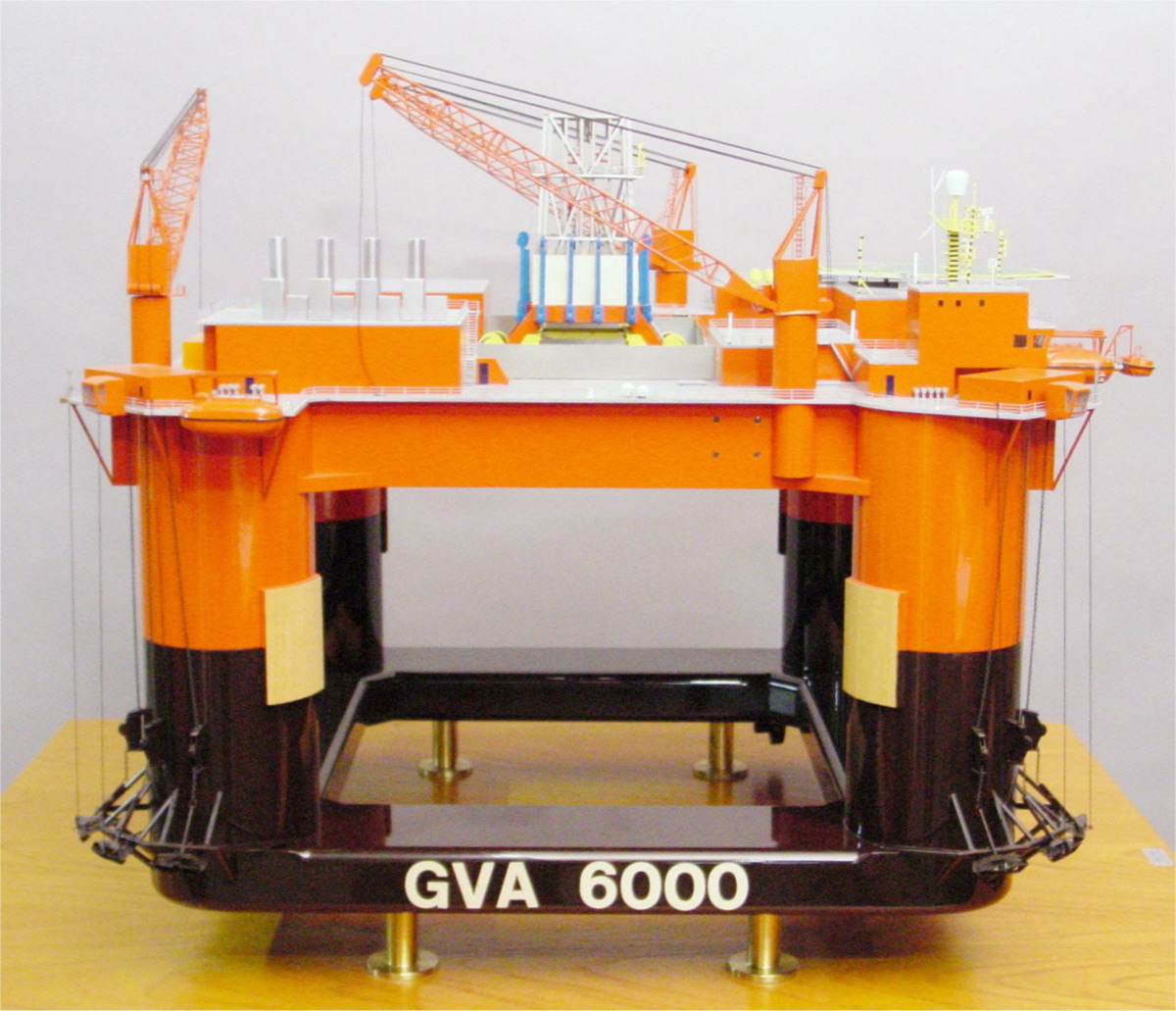 Plattform med däckshus, kranar, fackverkstorn och helikopterplatta. Plattformen vilar på fyra cylindriska ben sommanbundna nedtill med flytkroppar. Däckshus, plattformsidor och övre delen av benen orange, tak och däck grå, torn silver, helikopterplatta grön med gula markeringar, flytkroppar och nedre delen av benen mörkbruna. Modellen är monterad på en träplatta med plexiglashuv. Nr 150.