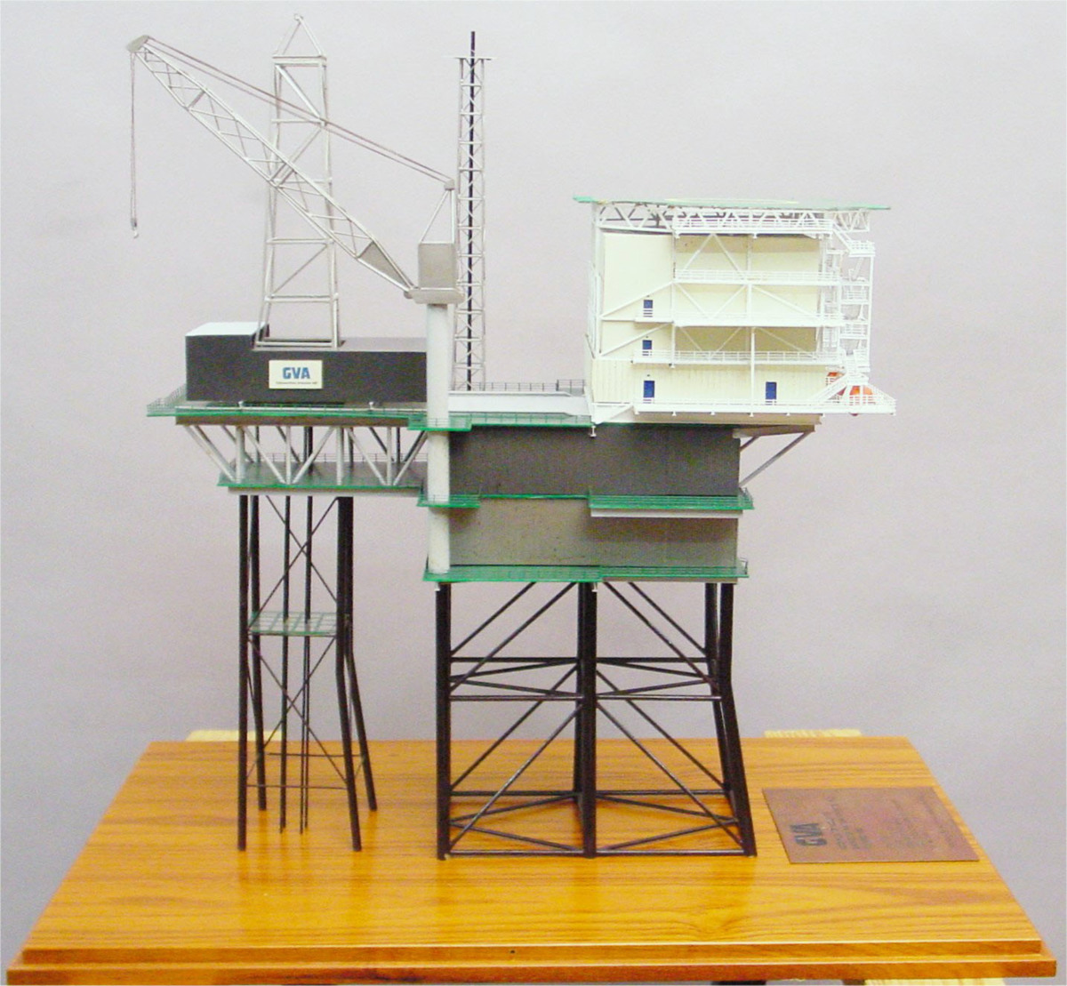 Bottenfast plattformsmodul grå och vita överbyggnader grönt däck och helikopterplatta samt brun benkonstruktion. Modellen är monterad på en träplatta med plexiglashuv.