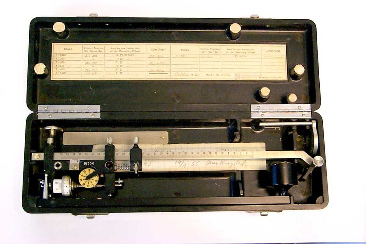 En planimeter är en anordning som mekaniskt mäter en yta och anger den på en trumma och skiva när en spets för längs kanten på figuren vars yta som skall mätas. Den består av en graderad trumma och skiva på ett skjutmått med en pekspets. Denna del kopplas ihop med en stång i vars ände det finns en förankring. Planimetern ligger i ett etui av svart bakelit med två knäpplås av metall.