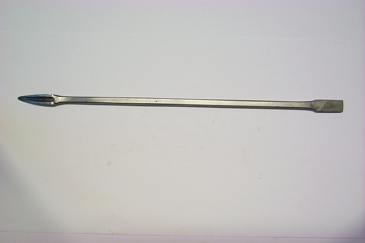 Skavstål i fyrkantsstål med bågformad avsmalnande spets i ena ändan och mejselformad i den andra ändan.