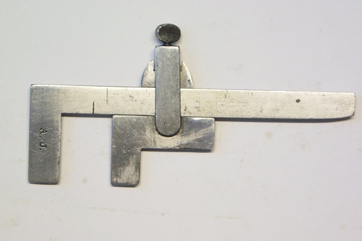 Egentillverkat skjutmått med ett skalstreck. Den justerbara delen låses med en stoppskruv. Enligt givaren har måttet använts till mätning av kannringar.