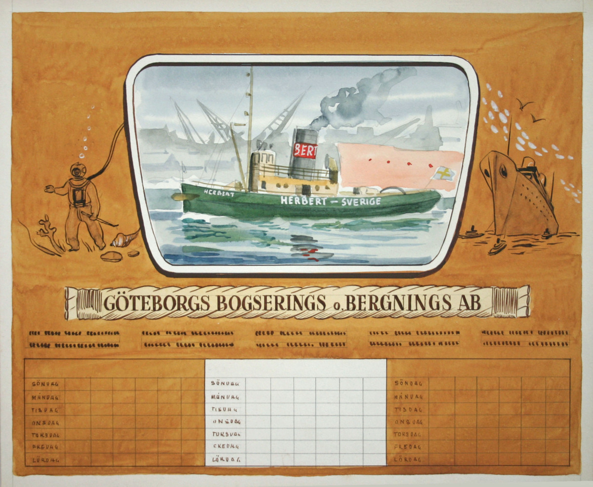 Förslag till almanacka. Målning av bogserbåten HERBERT. Stämpel på baksidan: 'Copyright Almqvist & Wiksells Boktryckeri A.B. Göteborgskontoret -Orvar Jansson'