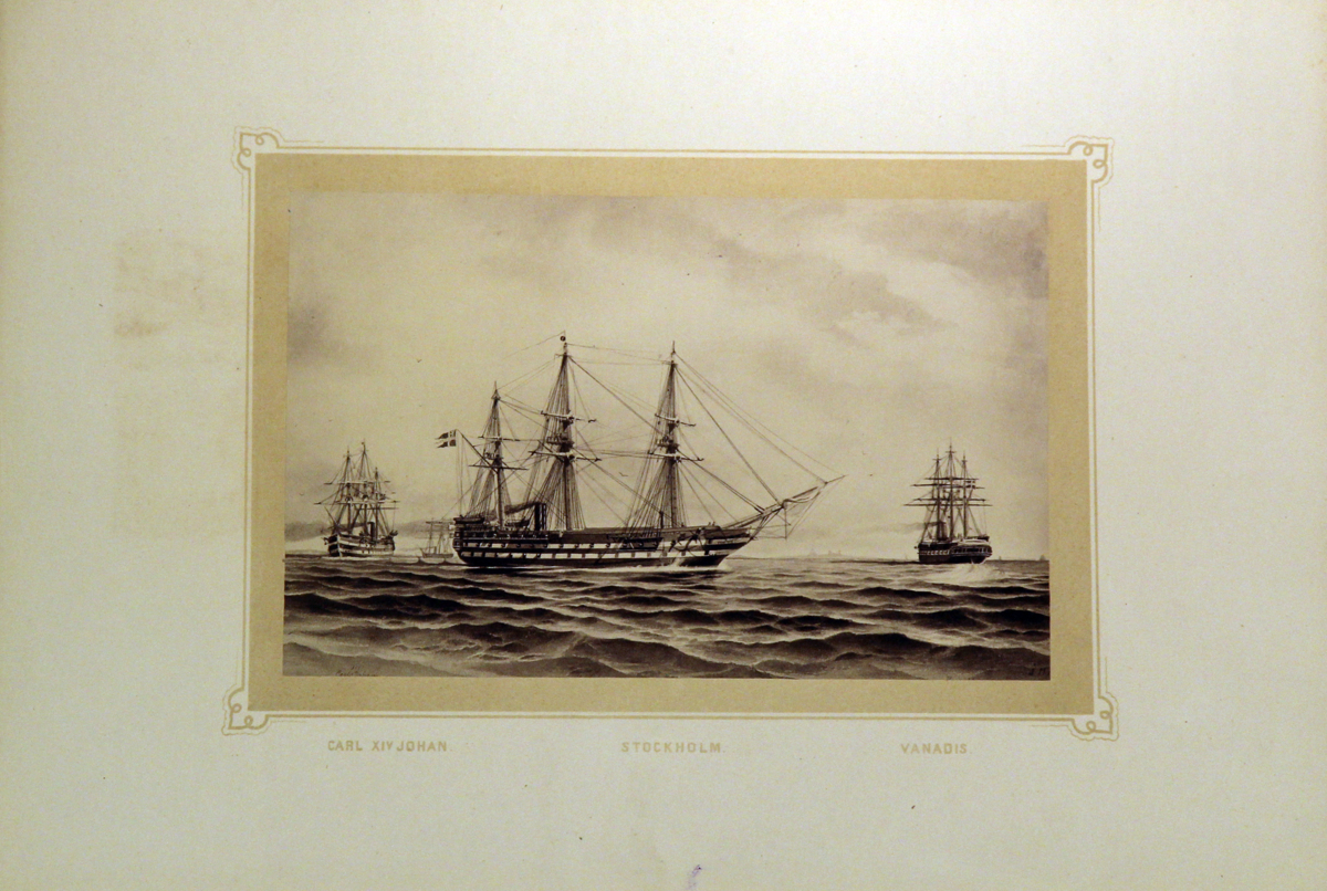 'KARL XIV JOHAN' linjeskepp byggd i Karlskrona 1824. Konstruerat av Borneman. Kungl. Svenska Marinen. 1852-1854 erhållit maskineri och blev sålunda Sveriges första ånglinjeskepp. 'STOCKHOLM' ånglinjeskepp byggd i Karlskrona 1856-1857. Kungl. Svenska Marinen. 1857 utgick på sin första exp. för att avhämta Sveriges dåvarande kronprinsessa Sofia av Nassau. 1861 exp. i Östersjön och Nordsjön. 1864 exp. i Östersjön och Skagerack. Härefter följde en lång tid, då skeppet låg förtöjt å Karlskrona varv. Enligt 1876 års K.Br. den 29/7 skulle skeppet t.v. behållas och nödtorftigt underhållas. Enligt 1879 års K.Br. den 30/5 skulle skeppet apteras till skolfartyg. 1882 blev detta beslut verkställt. Enligt 1891 års generalorder den 5/10 nedriggades skeppet och enligt 1892 års stationsorder omändrat till logementsfartyg. 1923 sålt för upphuggning och sönderbråkat vid Hallands Väderö. Foto av lavering av J.Hägg. Inv. nr 23,179.