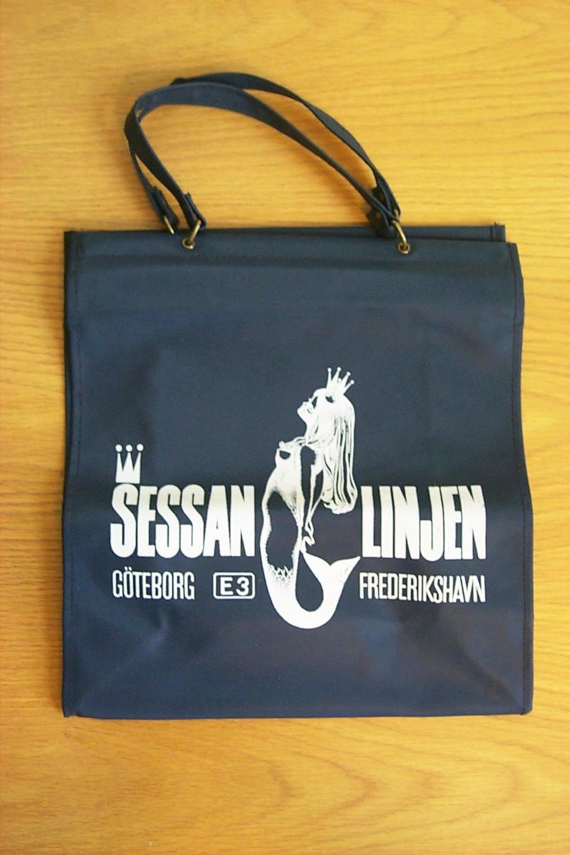 Handväska i blå vävförstärkt plast med platt botten och invikta gavlar. Långsidorna är förstärkta i överkanten med en metallskena. I metallskenan sitter två plastremmar fastsatta i metallsöljor som handtag. På väsklans sidor står Sessanlinjens logo. Ordet sessan med inledande esset krönt av en krona följt av en sjöjungfruprinsessa och därefter ordet linjen. På raden under står Fredrikshavn respektive E6 Göteborg.