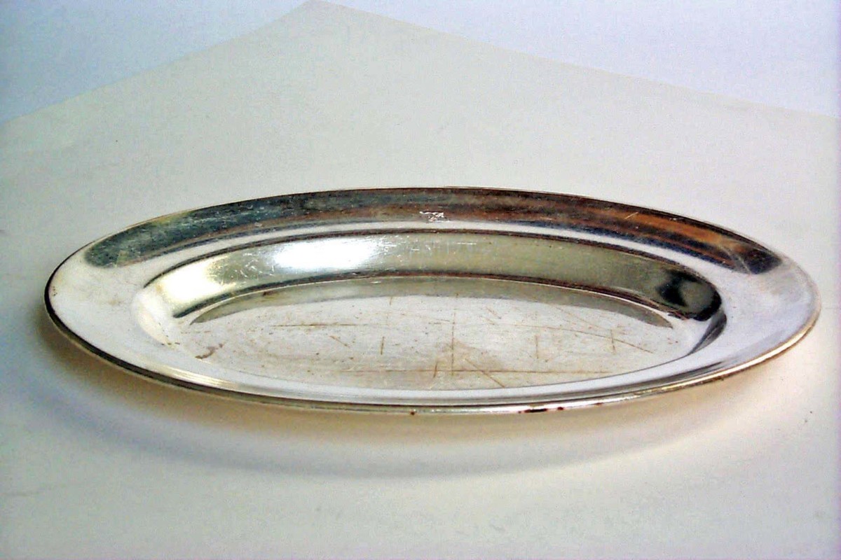 Ovalt uppläggningsfat med plan botten, låg kant som övergår i ett svagt lutande brett brätte. Dekorerad med stansad bolagsflagga.