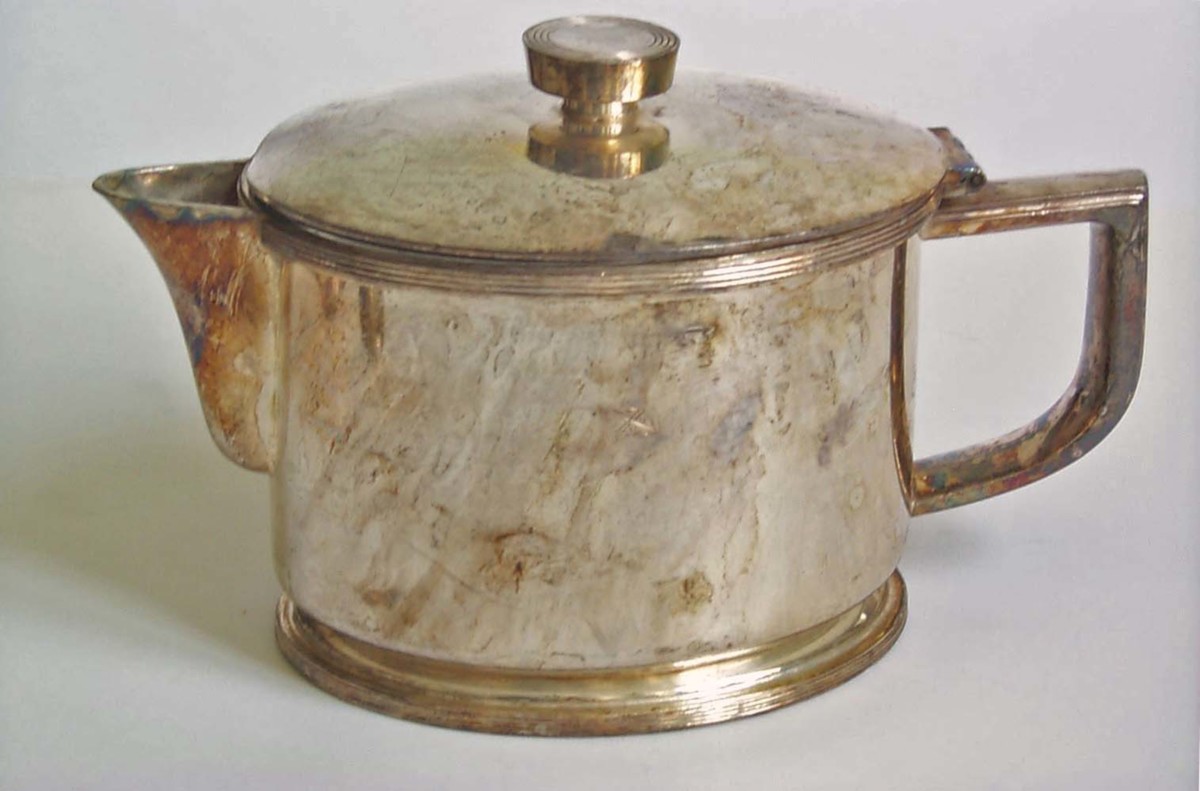 Oval tekanna med lodräta sidor stående på en 1,5 cm hög fot med samma dimensioner. På ena kortsidan en pip helt öppen upptill och innanför pipen är kannväggen perforerad som sil. På andra kortsidan ett vertikalt handtag som är fastsatt i båda ändar. Övre delen av handtaget går rakt ut och är skarpt vinklat nedåt. Nedre delen är rundad in mot kannan. Ett svagt välvt lock som är fäst vid kannan med ett gångjärn över det övre handtagsfästet. Centralt placerad locknopp. Dekorerad med stansad Transatlantics bolagsflagga.