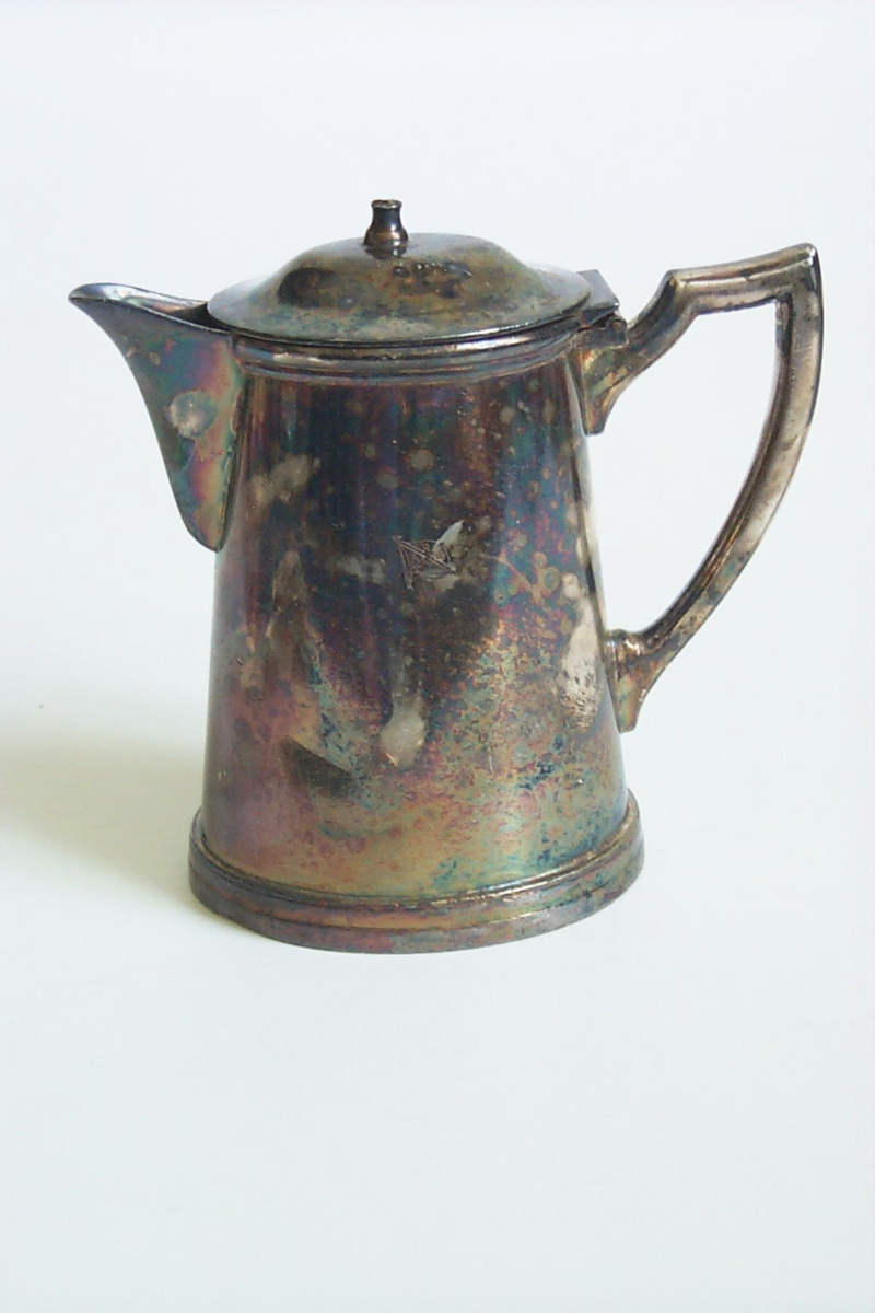 Oval kaffekanna avsmalnade uppåt. Vertikalt handtag som är fäst i båda ändarna. Lock som är fastsatt över det övre handtagsfästet med ett gångjärn. Dekorerad med stansad bolagsflagga.