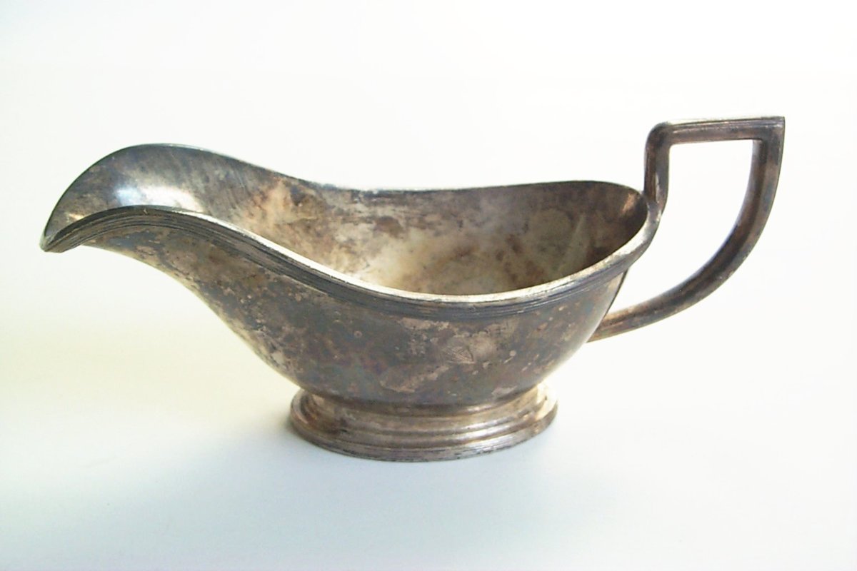 Skålformad oval såssnipa med uppåtböjd bred snip på en låg rund fot. På motsatta sidan av snipen ett handtag fastsatt i båda ändar med två vinklade böjar i överkant och en mjuk böj i nederkant. Dekorerad med stansad bolagsflagga.