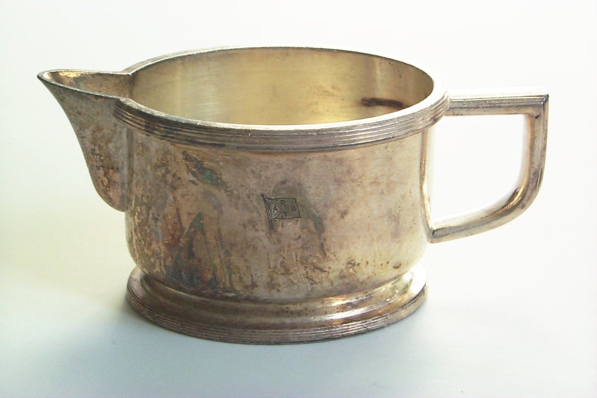 Oval gräddkanna av kraftig metall med lodräta sidor och stående på en låg fot. På ena kortsidan en utsvängd pip av tunnare metall öppen upptill. På den andra kortsidan ett lodrätt handtag fastsatt i båda ändar. Handtaget böjs i en rät vinkel upptill och en rund böj nedtill. Dekorerad med graverad bolagsflagga.