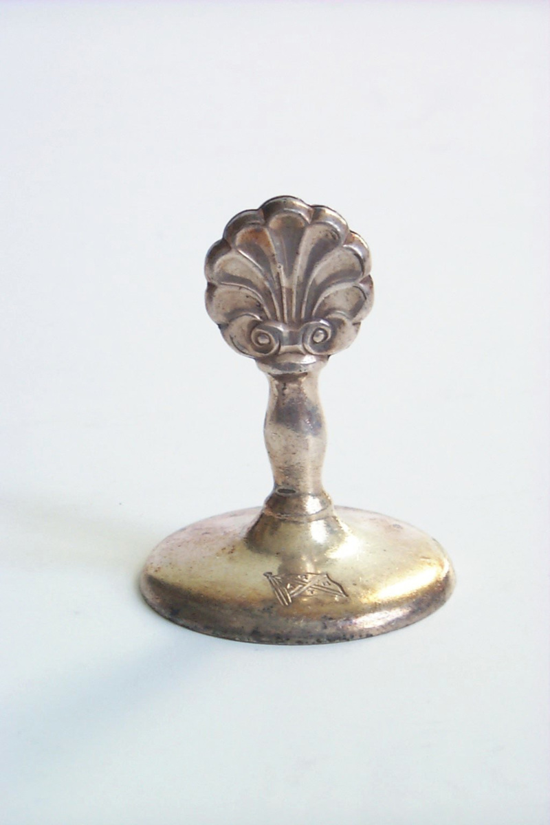 Korthållare i kraftig metall med bladformad platt överdel med slits i mitten på ett skaft över en rund bottenplatta. Dekorerad med stansad bolagsflagga.