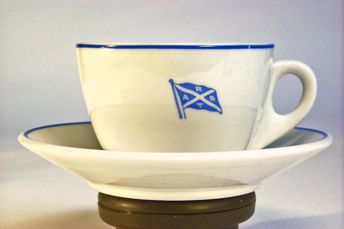 Tekopp med fat av vitt porslin med blå dekor i form av en rand runt kanten samt Transatlantics bolagsflagga på ena sidan under randen.