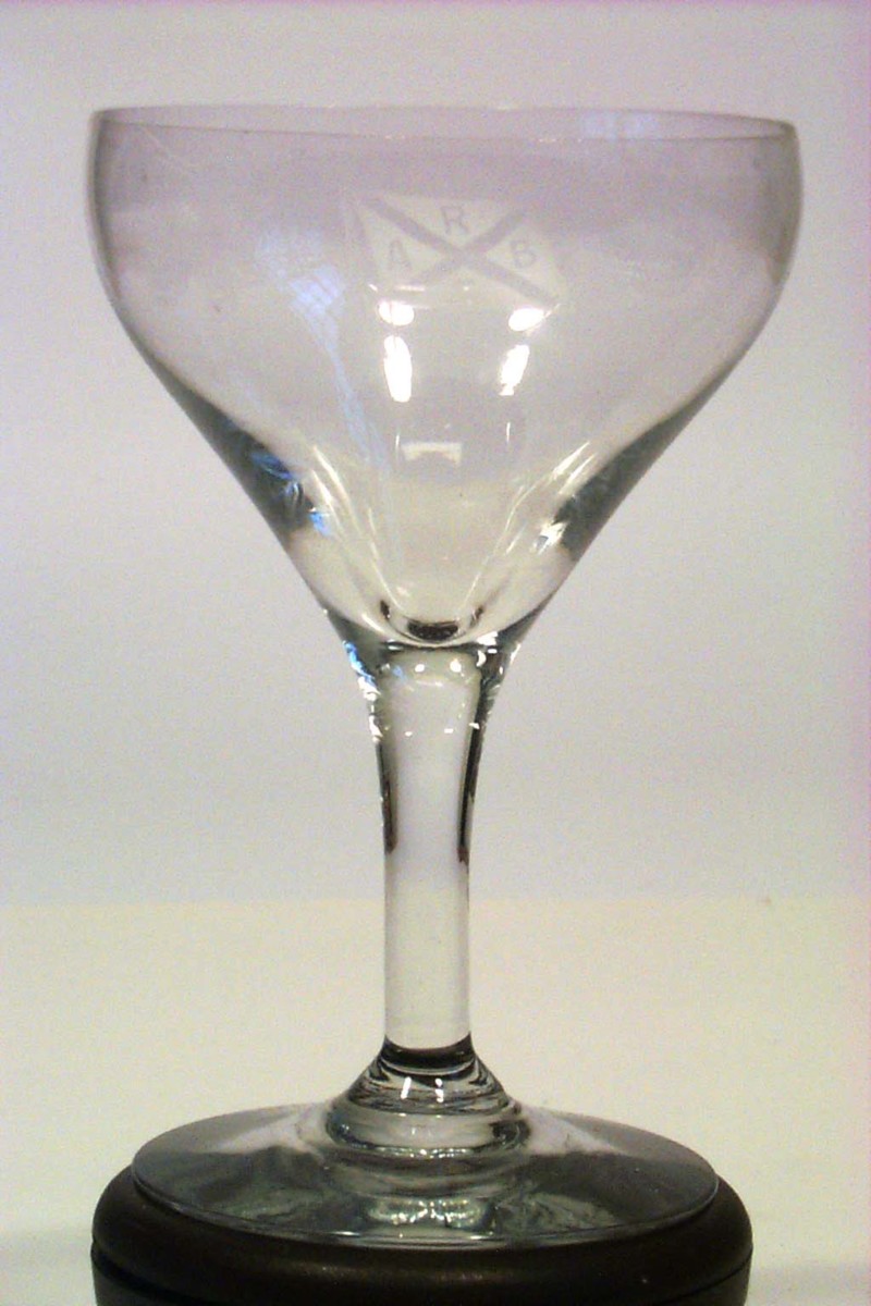 Vinglas på slät fot med trattformad kupa något insvängd upptill. Dekorerad med etsad bolagsflagga.