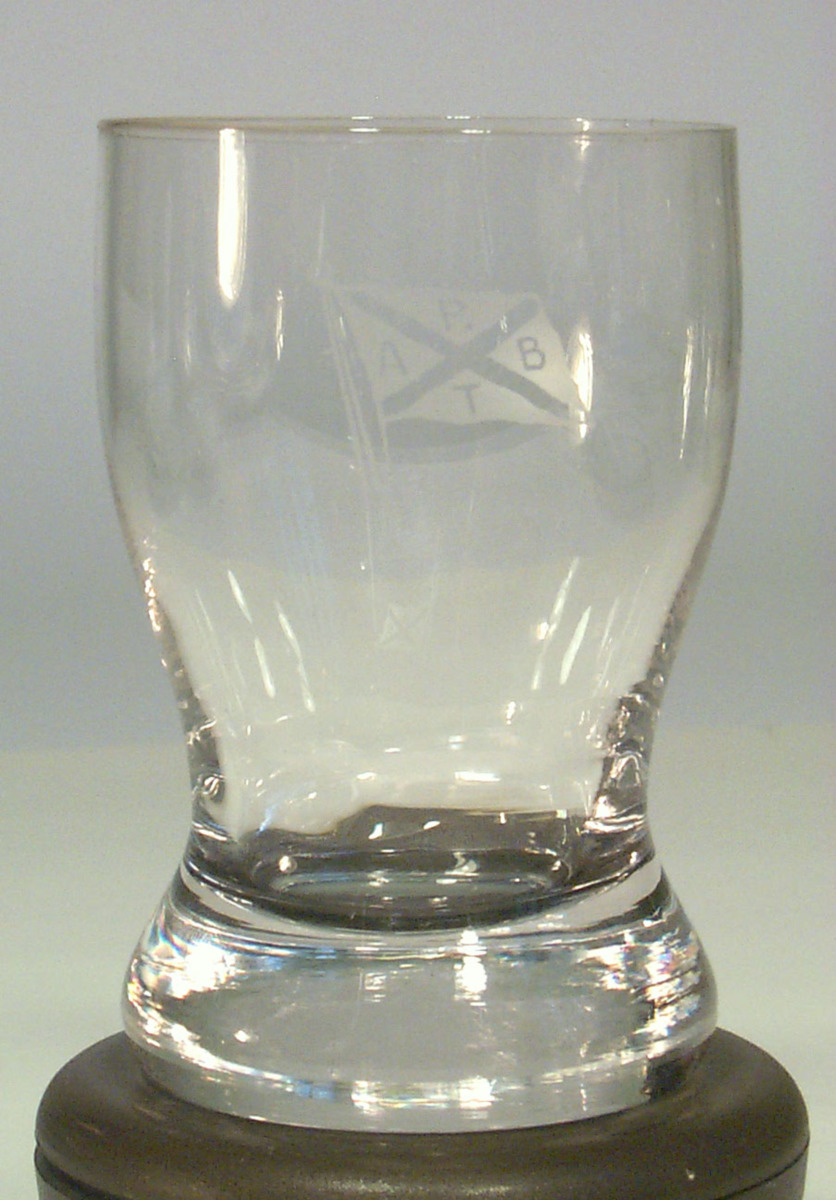Seltersglas med 2 cm tjock botten och insvängd midja över skarven mellan botten och kärl. Dekorerad med etsad bolagsflagga.
