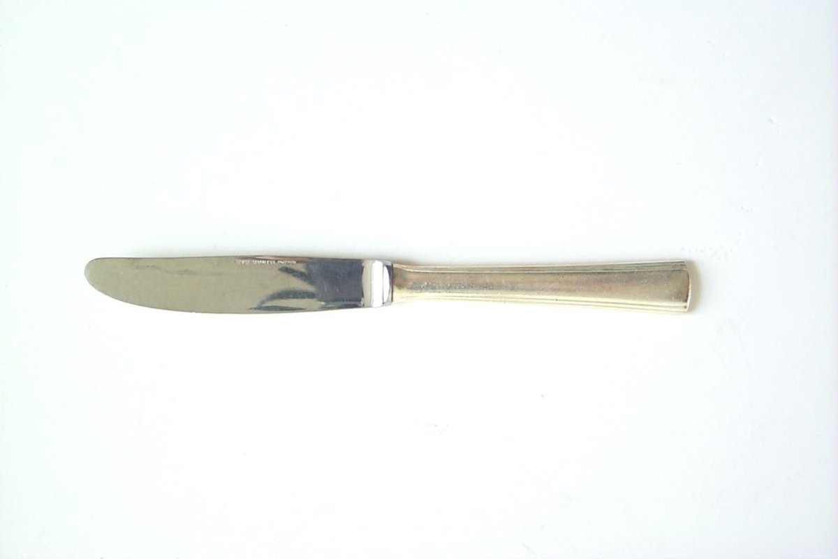 Kniv med fylligt skaft av nysilver med tvär ände och två dekorränder längs varje sida på skaftet. Blad av rostfritt stål.