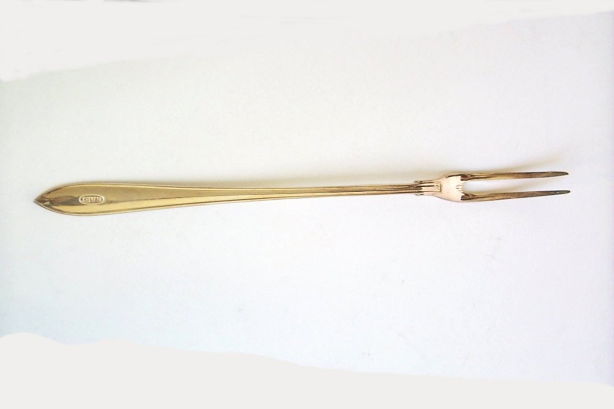 Lång smal gaffel med två gaffelspetsar. Platt skaft som avsmalnar i en vass spets och har en dekorrand som löper längs skaftets kant. Bokstäverna 'RABT' i en oval stansade på skaften.