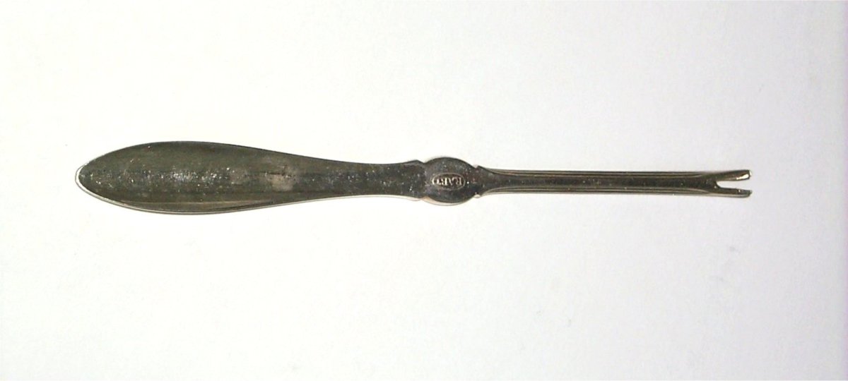 Skaldjursgaffel med liten platta i mitten och den ena sidan avslutas med en tvåspetsad krökt klo och den andra sidan är sked formad. Bokstäverna 'RABT' i en oval stansade på skaften.