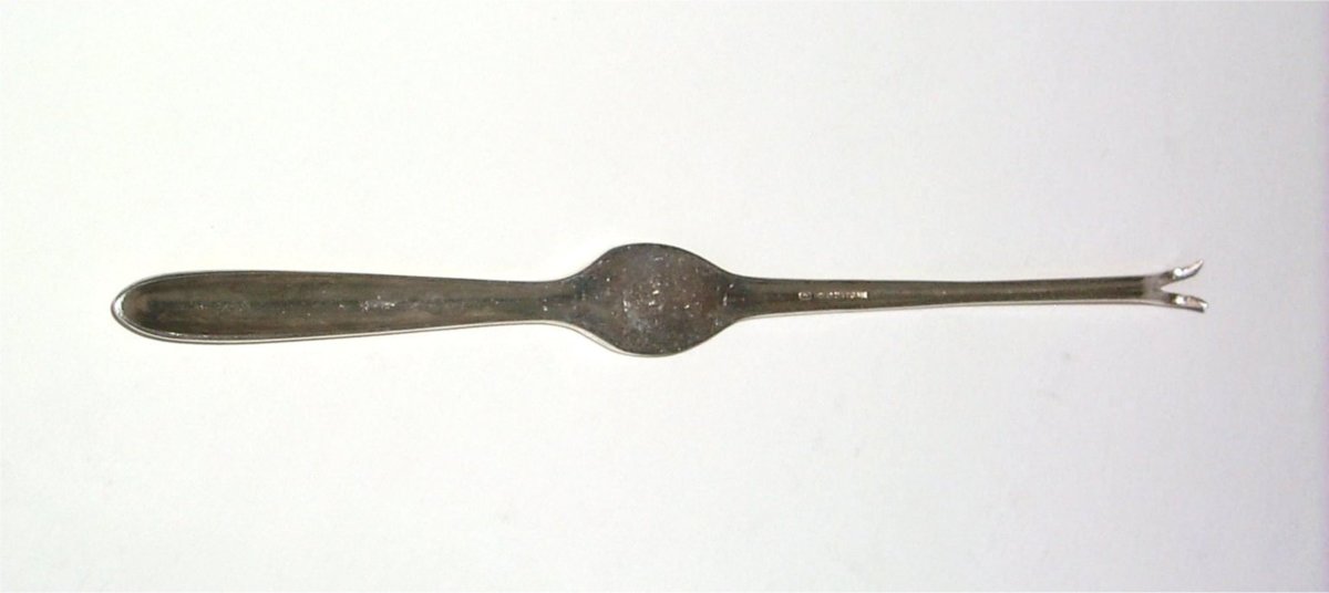 Skaldjursgaffel med en platta i mitten och den ena sidan avslutas med en tvåspetsad krökt klo och den andra sidan är sked formad.