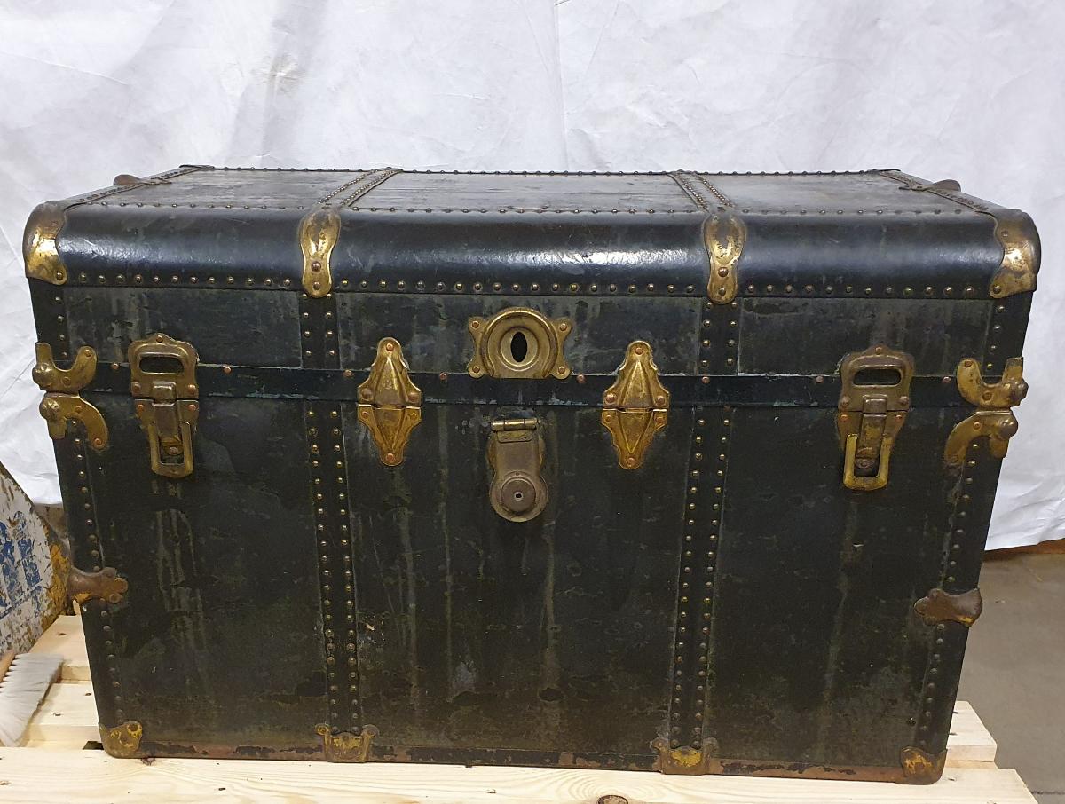 Kistliknade koffert av beklätt trä med väv och pappersklädd insida. Kofferten är försträrkt med spikade järnband längs alla kanter och med två band runt långsidorna. Järnbanden försedda med mässingsbeslag på alla hörn. På kortsidorna sitter handtag av läder fastsatta med mässingsbelag. Locket har avrundade hörn på långsidorna och är fäst med gångjärn längs ena långsidan. På den andra långsidan sitter tre exenterhaspar varav den ena är låsbar (låsregel saknas). Påklistrade lappar: Vänster kortsida UH: SS Stockholm Swedish American Line. Vänster kortsida NV: Swedish American Line Gothenburg, Class 3D Group 4. Fraktgods fr: Raflundabr…, Almedal