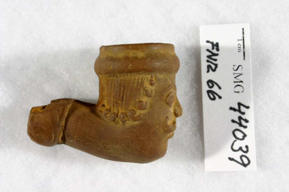 Piphuvud i rödgods. Plasitsk dekor i form av mansansikte/huvud.