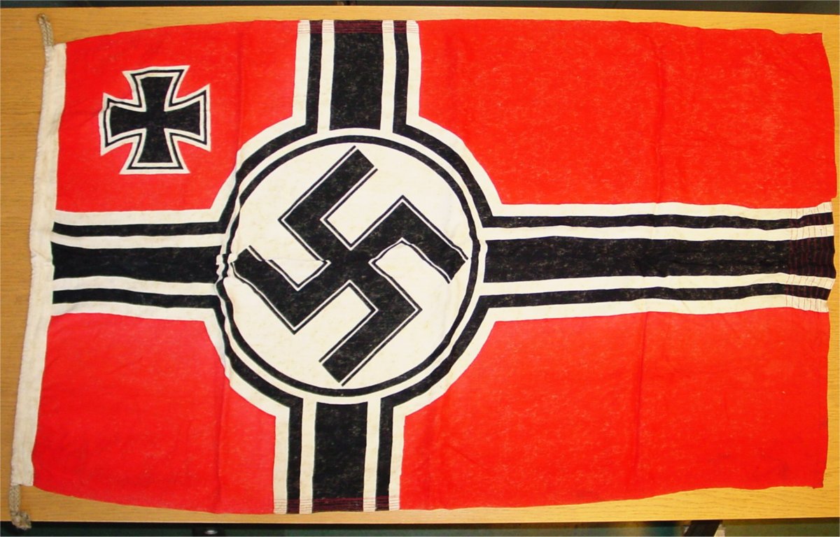 Tysk örlogsflagga från andra världskriget. Röd botten, svart kors med svart och vita kantlinjer. I korsets mitt ett hakors på vit botten. I den övre innre kvadranten ett svart malteserkors med svart och vita kantlinjer.