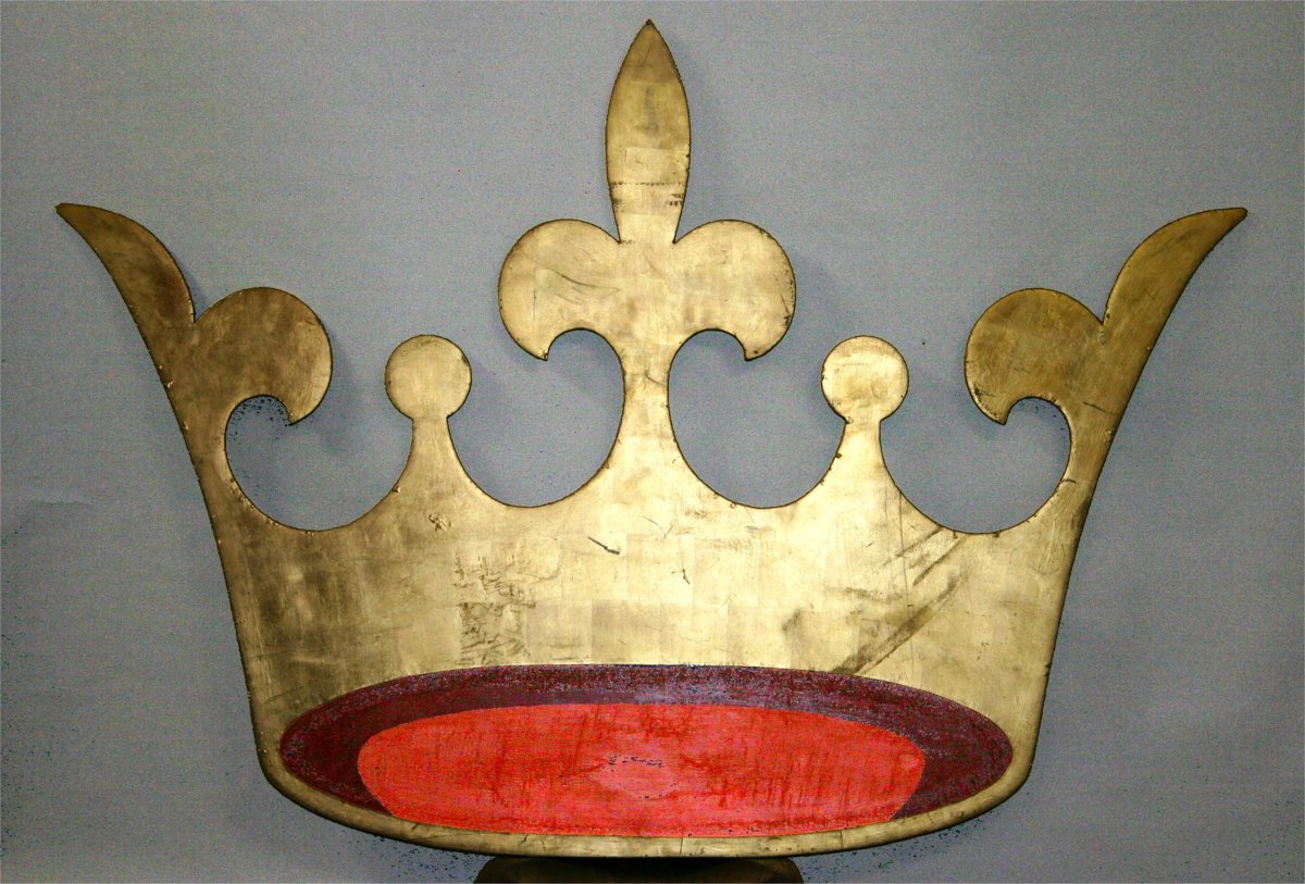 Krona i utskuren i aluminiumplåt med tre större och två mindre spetsar. Kronans framsida är förgylld. I nederdelen är ett öppningshål påmålat med röd färg delvis omgiven av en skuggkant med mörkröd färg.