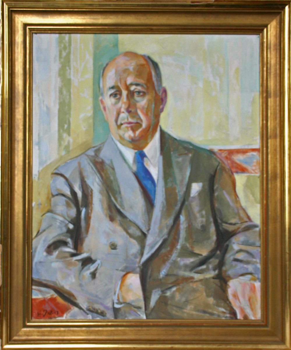 Porträtt i guldram. Föreställande Direktör Karl Erik Jacobson (1893-1980) som var direktör på Götaverken 1944-1957.