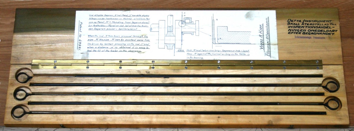 Sats med 5 bladmått med tjocklekarna 0,1-0,5 mm placerade i ett träetui. Et mått består av ett 45 cm långt rektangulärt rör av stål vars ena ände är vinklad 90 grader. I röret löper en stålstång vars ena ände är formad till en cirkel soml handtag. Den andra ändan är förlängd med ett till fem bladmått om vardera 0,1 mm. Genom att skjuta stången in i röret skjuts bladmåtten fram ur röret i nästan rät vinkel till röret. Rör och handtag är svartlackerade. Stängerna är märkta med den sammanlagda tjockleken på måtten. Etuiet är tillverkat av en masiv träbit med frästa uttag för måtten. Trälocket som är monterat med ett pianogångjärn av mässing och hålls låst med två schatullhakar av mässing. På lockets insida finns ett påklistrat ark anvisningar på danska och engelska samt påskrivet: 'Detta instrument skall återställas till inspektionsavdelningen omedelbart efter begagnandet.' följt av stämpel 'Rederiaktiebolaget Transatlantic'.