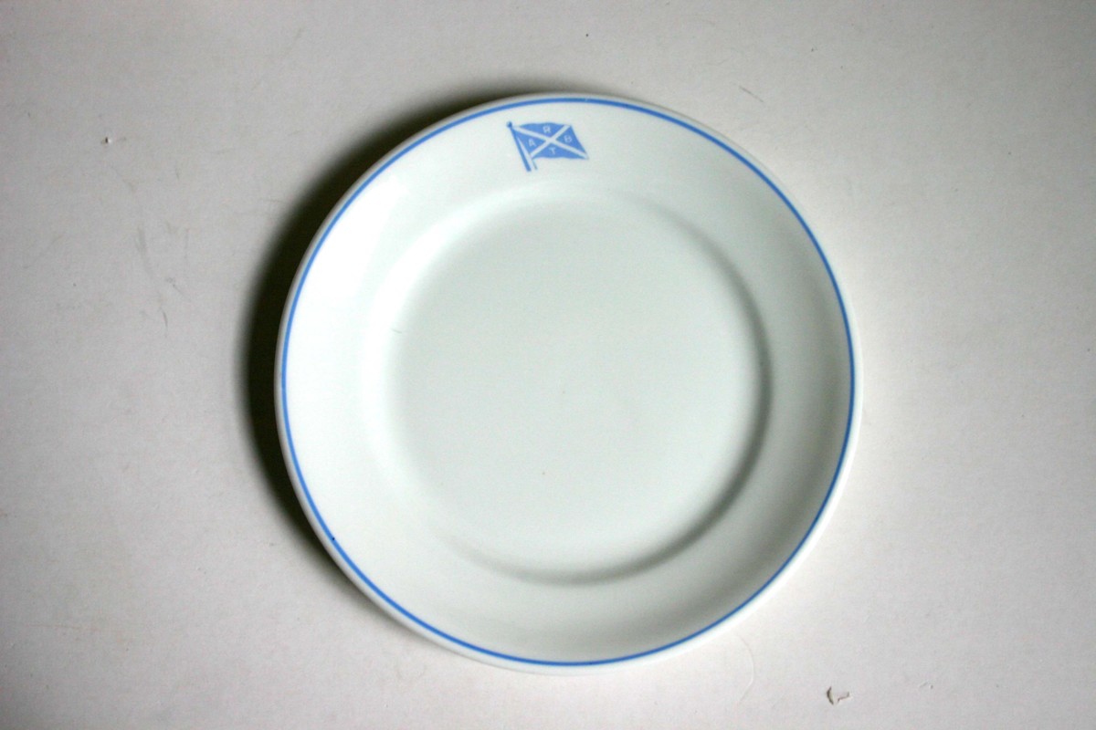 Tund tallrik av glaserat benborslin och en tunn ljusblå dekorrand runt brättet och på ena sidan av brättets ovansida Transatlantics rederiflagga i ljusblå färg.