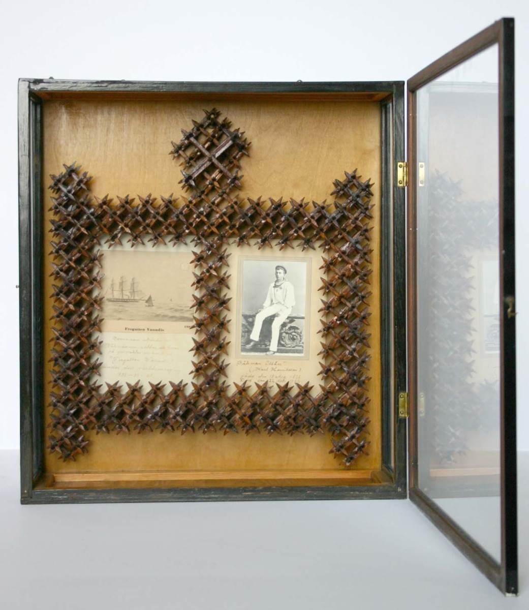 Pinnram med mittstolpe förlängd uppåt. I den vänstra ramhalvan en tryckt bild på fregatten Vanadis och handskriven text: ' Denna ram utfördes av Båtsmännen Abbor och Small på frivakten ombord på 'Fregatten Wanadis' under dess världsomsegling 1883-84-85'. I den högra ramhalvan ett porträtt av Båtsman 'Abbor' sittande på en utsmyckad barriär. Under bilden text: 'Båtaman 'Abbor' (Karl Henriksson) född den 13 Aug 1868. Död den 22 Nov 1942.