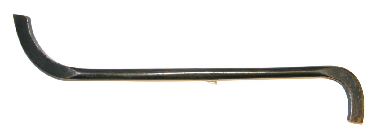 Rund mässingsstång med böjda ändar formade fyrkantiga. Verktyget har förmodligen använts på Eriksberg långt in på 1950-talet. Givaren har erhållit verktygen av en arbetskamrat.